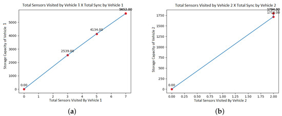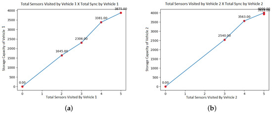 Total sensors visited versus total sync. (a) Total sensors visited by Vehicle 1. (b) Total sensors visited by Vehicle 2.