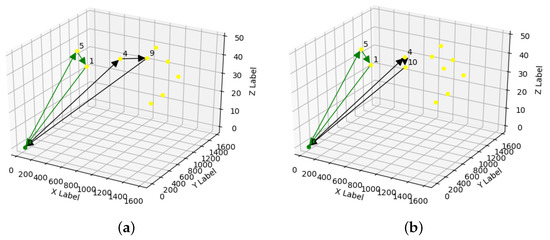 The most significant interest is that as many sensors or clusters can be visited, considering that vehicles have battery limitations. Moreover, UAVs must take off from the first point and end the flight returning to the same point for this scenario. To know the number of visited points, given a set of traveled edges, it is necessary to subtract , as the last edges traveled are relative to the drones’ turn to the first point. The objective of the optimization model is to maximize the number of visited points by maximizing the sum of covered edges. This objective is demonstrated in (2):