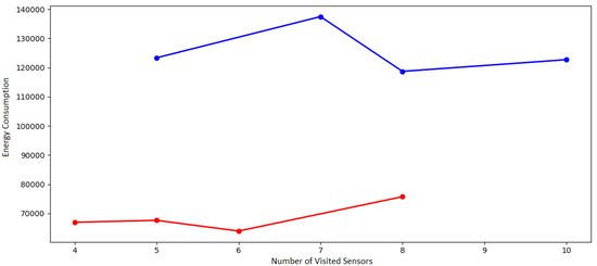 It is essential to highlight that, in Figure 2, the energy consumption changes and is reduced using the proposed optimization model. One optimization objective is to minimize the energy consumption of as many sensors as possible to be visited. At the last point of the graphs, it is possible to see that there is a similar drop in consumption in the illustrations. This drop happens because, even if the number of sensors visited is more significant than in the previous simulated set, more possibilities to minimize power consumption are created as the sample space increases.
