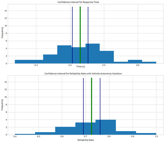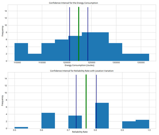 According to Figure 7 and Figure 8, the situation can happen because the basic premise is that each vehicle must leave and return to the starting point at least once. However, there may be situations in which the vehicle will not have enough autonomy to perform such tasks so that the simulation will show no doable results. From other replications of the simulations, 50 samples of mean values are extracted. Each of the samples is taken from a simulation run from a different instance, considering new sensor location points and variations in vehicle ranges.