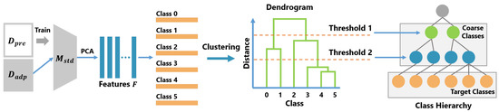 Most of the methods mentioned above assume that the class hierarchy is manually designed based on the human’s prior knowledge. On the other hand, there have been approaches to automatically construct class hierarchies from data. Methods for constructing class hierarchies are mainly divided into top-down methods [29,30,31,32,33] and bottom-up methods [33,34,35,36,37]. In the top-down method, a virtual abstract class is treated as a root node of a tree structure and a class hierarchy is constructed by recursively partitioning this root node until all classes become leaf nodes. In the top-down method, structures of class hierarchies are less constrained because the nodes can be divided in arbitrary numbers. However, the number of node divisions is a hyperparameter and must be set by humans. On the other hand, in the bottom-up method, each class is merged recursively with certain criteria until all classes are merged into one abstract class. Concretely, the bottom-up methods using hierarchical clustering [34,36], confusion matrices [33] and graphs [37] have been proposed. Hierarchical clustering creates dendrograms by recursively merging two classes (or clusters) based on the distances between features. The created dendrogram can be regarded as a kind of class hierarchy, but its structure is constrained by the binary tree. By extracting flat clusters from the dendrogram using a threshold, the constraint of the structure can be relaxed to some extent. However, the threshold needs to be given by humans. Our method determines the threshold for the dendrogram automatically. Hence, our method can construct class hierarchies without human’s prior knowledge at all.