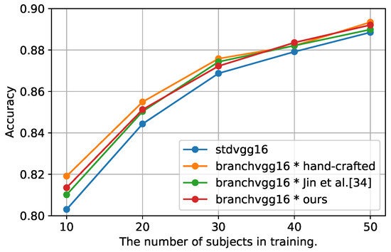 The validation results are shown in Table 3. In the table, VGG16-S represents the VGG16 model whose convolution filters were all halved and VGG16-W represents the VGG16 model whose convolution filters were all doubled. As the results show, in the VGG architecture, the accuracies of all models with a branching structure were higher than those of the models without a branching structure. The VGG16-S with a branching structure achieved the highest recognition performance, but the gain of recognition performance due to branching structure was the largest for the plain VGG16. The VGG19, which was deeper than the VGG16, and the VGG16-W, which was wider than the VGG16, had smaller improvements in recognition performance than the plain VGG16 due to the branching structure.