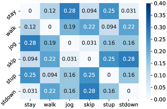 On the other hand, in the class hierarchy with the lowest accuracy, stay and jog, walk and stdown, and skip and stup were integrated in Level 2, while stay, jog, walk and stdown were integrated as one cluster in Level 1. In Figure 7, the percentage of integration of two different classes in Level 2 of the lower 1% accuracy class hierarchy is shown. According to the results, the percentage of integration of stay and jog, stay and stup, skip and stup, and skip and stdown was large in the Level 2 hierarchy of the bottom 1% and, especially, stay and stup is a pattern that also appears in the lowest class hierarchy in Table 4. This trend is similar to the Level 1 hierarchy. Since walk, stup and stdown are classes that are frequently misclassified with respect to each other, the integration of stay and stup in the lowest class hierarchy may have negatively affected the classification of walk, stup and stdown in the target classes, degrading the classification accuracy. In contrast, in the pattern where stay and skip are integrated, which is often seen in the top 1% accuracy class hierarchy, stay and skip are completely different activity classes. Therefore, it is considered that, even if a B-CNN model is optimized with stay and skip as the same class in the branched classifier, sufficient feature representation for activity classification can be obtained by optimizing the target classes.