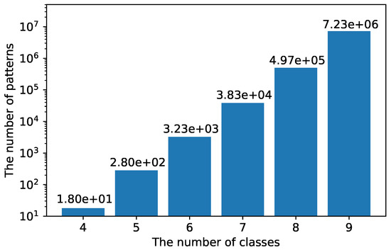 In Section 5.1.1, we verify that B-CNN improves activity recognition performance. However, in Section 5.1.3, it is shown that inappropriate class hierarchy degrades the recognition performance of the B-CNN model. Therefore, the design of the class hierarchy is an important factor of B-CNNs. One method for designing the class hierarchy is to manually design a class hierarchy based on humans’ prior knowledge. In this method, it is difficult to manually design the class hierarchy when the number of original classes is large. Here, Figure 8 shows the number of patterns created for a class hierarchy of height 3, as shown in Figure 2. According to the graph, the number of patterns of the class hierarchy increases exponentially as the number of the original classes increases. For example, when the original number of classes is 4, the number of patterns for creating a class hierarchy is 18. But, when the number of classes is 9, the number of patterns of the class hierarchy is as large as 7,226,538 and all searches are unrealistic.