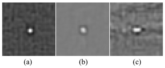 The DoG filter is almost the same as the LoG filter [24], which is one of the most popular blob detectors if σ 2 / σ 1 = 1.6 . Since the single-pixel target shows blob-like morphology due to the atmospheric turbulence and the point spread function (PSF) of optical lens, a single-pixel target affects about 3 × 3 pixels in the image. Given that the target sizes typically range from 3 × 3 to 5 × 5 in our applications and the LoG filter has the highest response with a target diameter of 2 2 σ [25], we set σ 1 = 3 / 2 2 = 1.06 and σ 2 = 1 . 6 × σ 1 = 1.70 , respectively. We also found that a minor adjustment of σ 1 and σ 2 will not significantly affect the results.