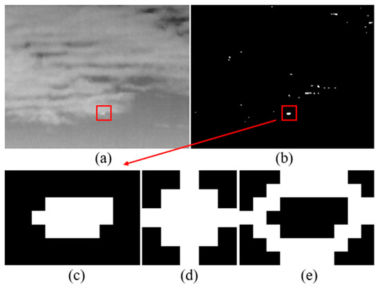 where ( c r o w , c c o l ) is the center coordinate of the filter kernel, ( i , j ) represents the pixel location in the kernel, r is a customer-selected parameter, and 2 is a proper value that has been demonstrated to work well in our experiments. The input image and the binarized mask are shown in Figure 4a,b, respectively, and Figure 4c represents the candidate target region. Here we regard the combination of the non-zero pixels in the convolution result of the candidate target region and binarized filter kernel w as the surrounding region, which is illustrated in Figure 4e. It should be noted that even if the clutters such as cloud edge may be denoted by the mask with large scale, the parameters of the DoG filter determine that a small target with a size ranging from 3 × 3 to 5 × 5 will achieve a higher enhancement than these clutters, as shown in Figure 4a,b.