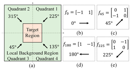 Inspired by the characteristics described in the introduction, the gradient distribution of an infrared target is typically a few higher than the surrounding areas [16]. We propose to divide the operation region into four quadrants and estimate the gradient features for each quadrant by performing different filters, as shown in Figure 5a. Since filtering results of the directions including 180 ° , 225 ° , 270 ° and 315 ° can be calculated by inverting the results of directions with 0 ° , 45 ° , 90 ° and 135 ° , we only perform gradient filtering on four directions, as shown in Figure 5b. Let Sij represent the sum of elements in matrix obtained by gradient filtering, with the value of i is 1 to 4 denoting the four quadrants and the value of j is 1 to 8 denoting 0 ° to 315 ° , respectively. The gradient score of each quadrant can be calculated by