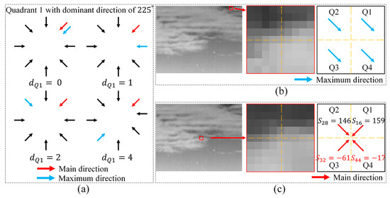 Figure 6. (a) Illustration of index distance calculation for quadrant 1 in different situations; (b) example of the four quadrants having the same maximum gradient directions; (c) example of dominant direction of two quadrants having a negative gradient score.