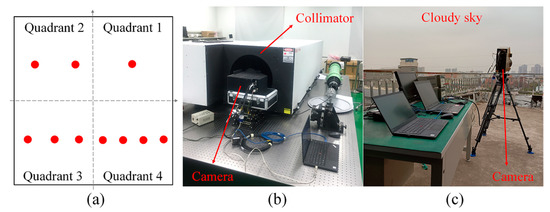 Figure 7. (a) Illustration of the target board, (b) single-pixel target acquisition, and (c) sequence acquisition with cloudy weather.