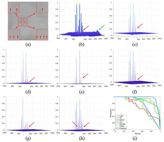Figure 8. The performance comparison of different methods on single-pixel target detection: (a) target image; (bh) normalized 3-D mesh obtained by the LCM [18], IPI [10], MCPM [19], LIG [22], PSTNN [12], FKRW [15], and the proposed method; and (i) PRC comparison. The red arrows indicate the targets, and the green arrows indicate the noisy clutters.