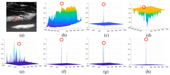 The imaging and detection of dim and small infrared targets in high-altitude scenarios have distinctive characteristics. First, the target size is typically less than 3 × 3, or even only 1 pixel due to long imaging distance. The optical path attenuation and large field of view (FOV) result in low signal-to-noise ratio (SNR) of the output image without any contour and textual features, making it difficult to detect by learning based methods [2,3,4]. Second, the background of the image is dominated by clouds, which are vulnerable to the negative impacts caused by irradiation and reflection of sunlight or moonlight, and these impacts further increase the difficulty of detection. Third, with the rapid development of infrared detector technology and performance, the latest IR imaging systems have shown a trend of “three highs” (high resolution, high frame rate, and high dynamic range). Consequently, these imaging systems put forward extremely high requirements on the computational efficiency of data processing methods, and a large number of conventional algorithms cannot meet the real-time requirements [5]. Finally, due to the difficulty of data acquisition for research and experiments, there are only a few high-performance IR detection techniques for dim and small targets in high-altitude scenarios.