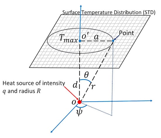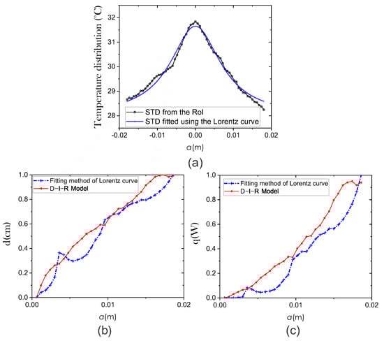 As is shown in Figure 5a, the experimental surface temperature distribution fits the Lorentz curve to obtain information of an internal heat source []. We have implemented a plugin in Matlab to obtain the STD fitted by the Lorentz curve method []. In this way, the estimated depth and intensity are acquired as and , for advisability, set . As is shown in Figure 5c, the angle of the curve can be obtained by .
