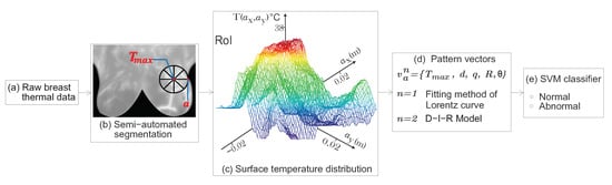 Therefore, based on the solution of the inverse heat conduction problem, we propose a highly discriminative pattern vector composed of physiological parameters to classify normal and abnormal thermograms. In addition, a well-defined RoI from the input STD is analyzed to extract the internal heat source parameters. Through SVM, the optimal radial distance a of the RoI is determined []. The proposed methodology was applied to 87 breast thermograms that belong to the - [,]. The proposed pattern vector is composed of the physiological parameters {} and is used for the classification by means of SVM. The three-dimensional feature space proofs the discrimination power of the proposed pattern vector, allowing the correct separation of both classes. At an optimal radial distance a of the RoI and through (1) the fitting method of Lorentz curve and (2) the D-I-R model, a CRC of % and 100%, respectively, are obtained using the physiological descriptors. The applied methodology allows reducing the rate of false-positives or false-negatives. Figure 2 shows the research methodology flowchart.