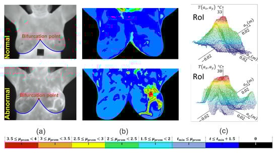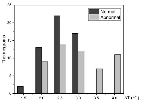 The STD for a set of 87 thermograms, 49 normal and 38 abnormal of the -, is analyzed []. Abnormal thermal patterns that may be linked to breast lesions are highlighted by an increase in the temperature of the affected tissue []. An increase in surface temperature is calculated for each thermogram. The Figure 7 shows that all the abnormal thermograms presenting temperature increases °C. Hence, the maximum temperature point of the RoI will be part of the pattern vector for the thermogram categorization.