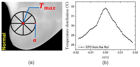 where is the temperature at any arbitrary point a on the STD of the thermal input data. The temperature distribution is obtained from the thermal input data at each side of the maximum temperature point . Thermal vectors are acquired in all four directions and are represented as straight lines of radial distance a as shown in Figure 4a. In this work, the four thermal vectors are averaged. Figure 4b shows the mean surface temperature distribution.