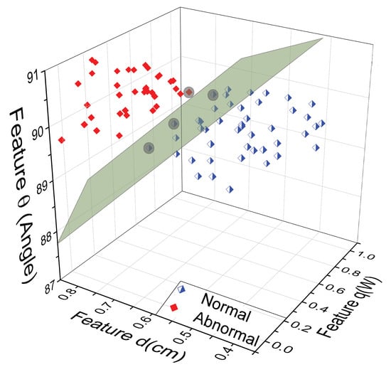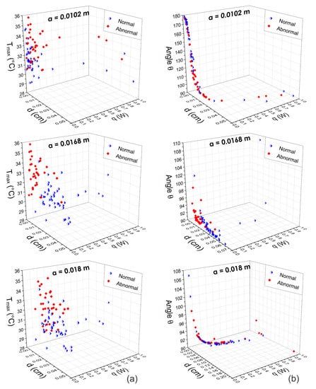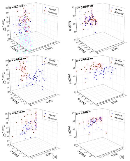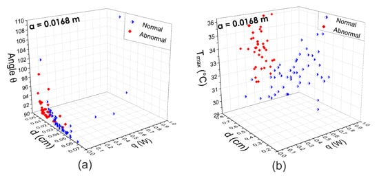 Thus, the internal heat source parameters d, q, and R are extracted from the obtained STD at different a positions. Figure 9, Figure 10 and Figure 11 show the three-dimensional feature spaces using the physiological parameters , d, q, and extracted at different a positions. The heat source parameters were obtained (a) by fitting the temperature distribution with the Lorentz curve () and (b) the D-I-R model () from Equations (5)–(7). Scattergrams proof the correct separation between normal and abnormal thermograms at the optimal position m that was determined using SVM. At different a positions, the physiological parameters are scattered from their respective cluster.