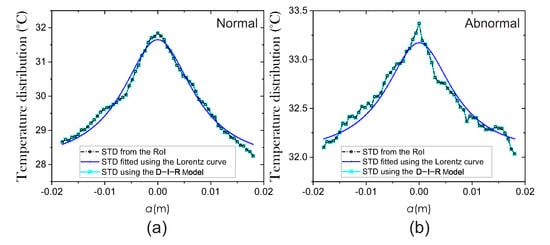 The surface temperature distribution , environment temperature °C [], and maximum temperature at the RoI are needed to extract the internal heat source parameters. For extraction of parameters, we applied the methodology mentioned in Section 2. Firstly, to measure the correlation between the STD from the RoI and the STD fitted by the Lorentz curve, we use the coefficient of determination R-squared []. In the same way, the correlation between the STD estimated using the Equation (4) of the D-I-R model and the STD of the RoI is measured. Therefore, the mean R-squared values corresponding to the 87 thermograms are and , respectively. Figure 8 shows the estimated STD employing the two methods.