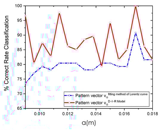 Figure 12 shows the CRC percentages achieved at distinct a positions. As can be seen, the highest percentages using the pattern vectors extracted with the fitting method of Lorentz curve and D-I-R model resulted in the same m position.