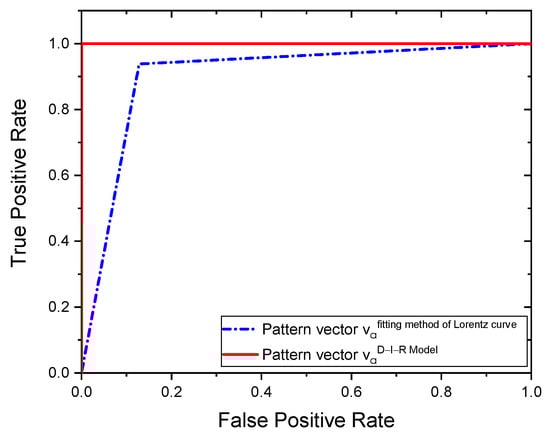 The ROC curves from the two tested methods reached high performances, as shown in Figure 13. On the other hand, the area under ROC confirms that the proposed pattern vector has better performance since it has an area of 1, followed by the proposed vector with an area of . In this study, for the pattern vectors obtained with the fitting method of Lorentz curve and the D-I-R model, we achieve higher performance CRC rates of % and 100%, respectively, and an area under the ROC curve of and 1 for the two methods employed.