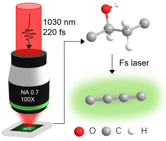 Owing to the ease of creating highly-localized and targeted material modifications by femtosecond direct laser writing, microscale functional devices can be fabricated in situ [10,11]. In addition, in situ femtosecond-laser-induced fluorophores in transparent organic materials have enabled a growing number of applications, such as optical data storage [12,13], microfluidics [14], and patterning [15]. The stimuli-responsive properties of fluorescent materials have also been implemented for information security encryption [16,17].