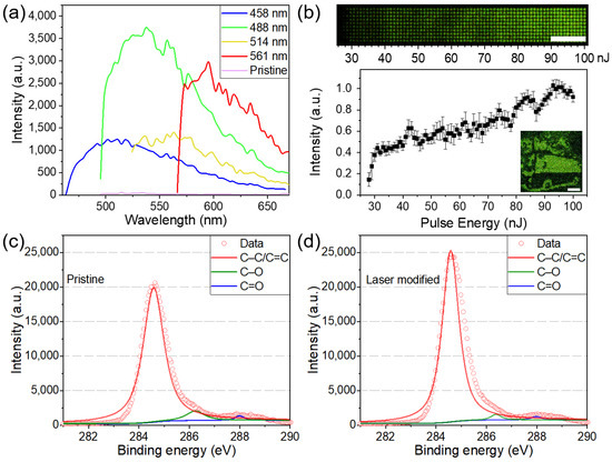 (a) Photoluminescence spectra of modified PVA samples for different excitation wavelengths and pristine PVA sample for the excitation wavelength of 488 nm. (b) Confocal fluorescence microscopy image of voxel array excited at 488 nm. Fluorescence intensity as a function of pulse energy. The inset is a 4-level picture of a bus. The scale bars are 50 μm. XPS spectra of (c) the pristine PVA sample and (d) the laser-modified PVA sample.