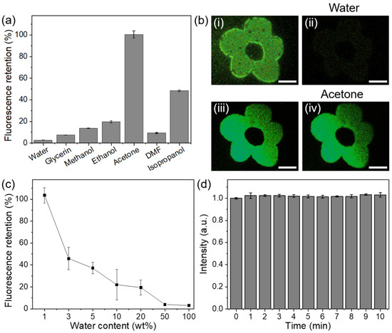 Reagent sensing characteristics of the fluorophores. (a) Fluorescence retention of different solvents on the laser-modified PVA samples. (b) Fluorescence images of two patterned PVA samples before and after water (i,ii) and acetone (iii,iv) dropping, respectively. The scale bars are 50 µm. (c) The fluorescence retention as a function of water content in acetone. (d) Fluorescence intensities of the laser-modified PVA after continuous exposure to 488-nm-wavelength excitation. The intensities are normalized to the first measurement.