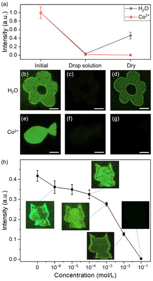 It was also corroborated that fluorophores could respond to metal ions in the form of fluorescence property changes, as reported previously [33,34,35,36,37]. Assuming this characteristic, laser-induced in situ fluorophores could be used for implementing “burn after reading”, for data security. In Figure 4a, the fluorophores were permanently turned off after dropping the Co2+ aqueous solution (0.1 mol/L). The fluorescence intensity remained negligible after drying (from 1.9% to 0.1%). The irreversible quenching is attributed to the reaction in which the empty orbital of Co2+ is coordinated with the electrons of carbonized clusters so that the fluorescence is still inhibited after drying [34,35,36]. In addition to Co2+, other transition metal ions with empty orbitals, such as Cu2+, Ni2+, Fe3+, Cd2+, Pb2+, and Hg2+, may also be exploited as quenching agents. An example is presented in Figure 4e–g. In addition to data security applications, laser-induced fluorophores could be used for quantitative detection of metal ions, utilizing the quenching property. A series of laser-patterned PVA samples was dripped with Co2+ aqueous solutions of different concentrations, respectively (0 to 10−1 mol/L). After subsequent drying, the fluorescence recovered partially depending on the cobalt ion concentration (Figure 4h). Based on this principle, quantitative measurement of metal ion concentrations in solution can be implemented.