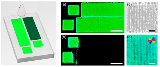Hydrophilic surface laser patterning. Fluorescence images of the hydrophilic patterns (a) before and (b) after dropping the Co2+ aqueous solution (0.1 mol/L) at the far right of the patterns. The gaps between the left squares and the right rectangles are 100 μm. The scale bars are 500 μm. (c) Corresponding SEM and (d) birefringent slow axis orientation images of the laser-patterned PVA surface. Pseudo colors (inset (d)) indicate the direction of the slow axis. The scale bars are 10 μm. Laser parameters: 300 mW, 10 mm/s scanning speed, 1 MHz repetition rate, 0.25 NA objective lens.