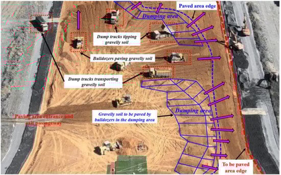 The paving operation is an important part of the construction process of earth-rock dams []. Generally, bulldozers and dump trucks constitute the construction machinery for the paving of earth-rock dams for meeting the tight construction schedule. The paving work involves a series of varied operations such as cutting, carrying, spreading, and simple grading. In each stage, there are specific requirements for the operation mode, driving path, and paving parameters of bulldozers and dump trucks. Failure to meet these requirements may result in unqualified paving results such as uneven paving, thus affecting the compactness quality of the final earth-rock dam and reducing the service life of the dam [,,]. Therefore, the quality evaluation and feedback control of the bulldozer paving operation is of great significance for ensuring the paving quality [].