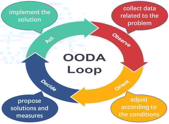 The OODA loop is a closed-loop tactical concept that uses information interaction to optimise tactics in real time and includes the stages of observe, orient, decide, and act [], as shown in Figure 3. The observation stage mainly comprises the collection of data and information related to the problem; the orient stage is used to analyse and process the information obtained via observations and make adjustments according to the specific conditions; the decision stage is used to propose solutions and measures for addressing the problem to form a solution and is the key module for realising feedback control; the act stage is used to implement the solution. This method can be used to simulate the development and operation of agents [].