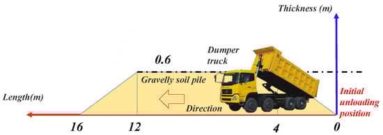 Figure 5. Unloading process diagram of dump truck. - The thickness is generally updated according to the elevation value in the cell, and because the thickness update is the last step of the cell state update, the active state value is set to 0 after the thickness update. Thickness state transfer should satisfy the Equation (4).where, d is the thickness, m; is the updated elevation of the cell, m; is the elevation before updated of this cell, m.