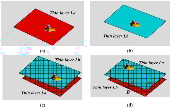 In the observation module, according to the characteristics of the CA, the work block is divided into equal-sized square grids, where each grid corresponds to a cell, and the cell stores the location coordinates, elevation, thickness, and other information of the corresponding grid []. As shown in Figure 6, the GNSS installed on the bulldozer records the position information in real time. After the paving of the storehouse surface is completed, the fitted elevation of the storehouse surface is obtained by extracting the paving trajectory information of the storehouse surface as shown in Figure 6a. When starting construction on a new layer, the system fits and updates the elevation map by acquiring the trajectory of the bulldozer in real time as shown in Figure 6b. Figure 6c shows the superimposition of the elevation maps of two paving thin layers. The thickness d at an arbitrary location can be obtained by calculating the height difference between the two planes, as shown in Figure 6d. In this manner, the simulated work block is established, and the cells can update their internally stored information by means of an external input (see Section 4.3 for parameter acquisition details). This completes the perception of the paving quality parameters in the observation module [].