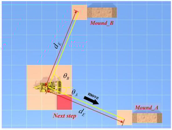 In the move state, it should first be determined which mound’s starting cell is closest to the bulldozer, and the bulldozer should then be guided to travel to this starting cell position. According to the action model of the bulldozer, it is more inclined to move in a straight line than to turn in a large angle. Therefore, it is unreasonable to use the Euclidean distance to measure the distance between the bulldozer and the starting cell. The relative positional relationship between the starting cell and bulldozer and the course of the bulldozer should be comprehensively considered, a distance measurement function should be established, the angle measurement weight should be added on the basis of the Euclidean distance measurement, and the composite distances should then be compared to obtain the optimal solution. The specific formula for this is as follows: