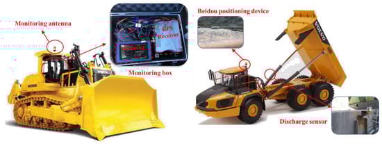 It is necessary to obtain the discharge time and location to understand the dynamic pavement quality situation []. This can be realised by installing a BeiDou satellite positioning terminal and discharge sensor on the dump truck. The discharge sensor can sense the rise of the hopper and send the discharge signal to the BeiDou positioning terminal. The BeiDou positioning terminal can edit the position information and time information at this moment into a short message and send it to the server, which thereby obtains the discharge-related information.