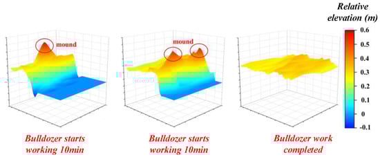 The various stages of the bulldozer operation can be clearly distinguished in the figure. In the beginning, as there are many unpaved places, it can be clearly observed that the paved and unpaved layers are connected in a stepped manner. Furthermore, owing to the existence of a mound in the area, red protrusions can be clearly observed in the colour map. At this time, the average paving thickness is generally below the standard value; thus, there is no need to consider the flatness. After approximately 25 min, similar features can still be observed, but the area of the paved portion becomes significantly larger, and the unpaved portion decreases. At this time, the average thickness may have reached the standard value, but it can be intuitively determined that the flatness has not yet met the requirement. When the paving is completed, it can be observed that the entire area is yellow in the map, and the elevation difference is small, indicating that the paving has been completed. This is when the average thickness and flatness have met the requirements.