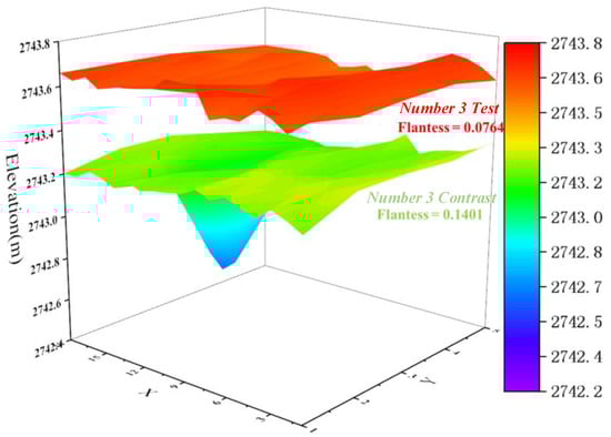 In addition, the effect of the dynamic assessment can be compared horizontally with the effect of traditional work methods. The Number 3 Test experiment set and Number 3 Contrast comparison set are considered as examples for the analysis. The two sets are similar in size, shape, and elevation. The three-dimensional surface colour map can be plotted according to the elevation at each position at the end of the paving of the two sets, as shown in Figure 11. It can be clearly observed that the comparison set exhibits a serious ultra-thin phenomenon, while the thickness of each area of the experimental set is relatively average; thus, good results were obtained in the dynamic assessment [].