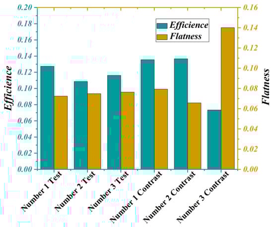 The average value of the standard deviation of the comparison group is 0.095, and that of the experimental group is 0.0746, which is 21.5% less than that of the comparison group. In addition, from the longitudinal comparison within the group, the maximum value of the comparison group is found to be 0.1401, the minimum value is 0.0657, and the former is more than twice that of the latter. The maximum value of the experimental group is 0.0764, which is less than 6% greater than the minimum value of 0.0724. It can be observed that the use of this quality control method can stabilise and improve the quality of paving construction. The efficiency and flatness results of each group of experiments are shown in Figure 13.