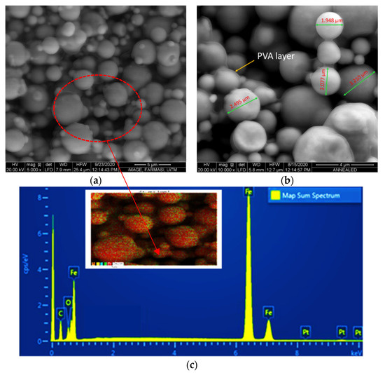 Micrograph observation was conducted in the absence of a magnetic field to investigate the distribution of CIPs within the matrix. Figure 2 shows the microstructural observation and EDS mapping analysis of the PVA-based MRP sample. As shown in Figure 2a, the CIPs were observed to be homogeneously distributed in the matrix of the PVA-based MRP, suggesting a uniform distribution of CIPs inside the matrix. Moreover, Figure 2b indicates the existence of a transparent layer by showing a PVA layer that enwrapped the CIPs, which is consistent with the findings by Xu et al. [11]. Meanwhile, in Figure 2c, the EDS analysis shows the presence of three elements in the PVA-based MRP sample, which are carbon (C), oxygen (O) and iron (Fe). The two elements, C and O, represented the PVA structure, whilst Fe represented iron for the CIPs. As the PVA (C2H4O) itself contains a hydrogen (H) bond, the element should be presented in the EDS analysis; however, it could not be detected due to limitation of the EDS detector. According to Wilson et al. [29], the existence of hydrogen bonding in the polymeric matrix would increase the stability of the CIPs over time, and simultaneously reduce the settling issue.
