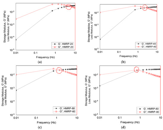 In the absence of an external magnetic field, the storage modulus, G′ of all samples increased with increasing shear frequency from 0.01 to 10 Hz, suggesting a change of ST behavior in the PVA-based MRPs. The increase of storage modulus reached saturation at high shear frequency. Moreover, it was noticed that t G′ was higher than G″ for all samples at higher frequency, which indicated stiffer samples. The result suggests that the materials transformed to a harder state in response to the external shear stress in terms of shear frequency, which signifies the ST effect phenomenon [30]. Prior to the change of ST effect in the PVA-based MRP samples, it was important to determine the physical state of the PVA-based MRP to distinguish the states of liquid-like and solid-like PVA-based MRP by analyzing variation of G′ and G″ as a function of frequency. Generally, the material would exhibit liquid-like (viscous) behavior when G″ > G′. In contrast, when the G′ > G″ the PVA-based MRP was in a solid-like (elastic) state. For example, as shown in Figure 3a for HMRP-20, it was noticed that the loss modulus, G″, is greater than the storage modulus, G′ until reaching the “cross-over” (CR) point at a frequency of ~3.5 Hz. This CR point suggested that at the beginning of the reaction, the HMRP-20 behaved in a liquid-like state, which was viscous. However, as the frequency increased, the material became stiffer above the CR point and exhibited a solid-like state.