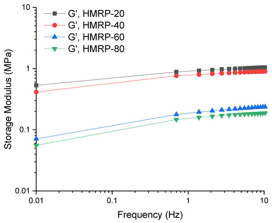 As shown in Figure 4, it was observed that the G′ of all PVA-based MRP samples increased with increasing shear frequency from 0.01 to 10 Hz under the magnetic field, which proved that the PVA-based MRP would become stiffer at a higher external shear frequency. In fact, the G′ was always greater than the G″, which means that all samples exhibited solid-like behaviour when exposed to the magnetic field due to the strengthening of CIP interactions [34,35] Moreover, it was also proved that the PVA-based MRP exhibited a synergistic effect as the PVA-based MRP responded to two different external stimuli simultaneously, namely shear frequency and magnetic field. In the condition under the magnetic field, the CIPs played a big role in strengthening the PVA-based MRP by rearranging themselves into chain-like structures depending on the strength of the magnetic field. The HMRP-20 sample exhibited the highest G′max, at approximately 1.708 MPa under a magnetic field of 180 mT. The G′max showed a decreasing trend with an increasing DMSO content, which was 0.922 MPa for HMRP-40, followed by HMRP-60 and HMRP-80, which were 0.248 and 0.197 MPa, respectively. The decrement of G′max could be explained by the movement of the CIPs within the polymer matrix as a result of magnetic field excitation during shear formation. For instance, the CIPs were more likely to move and form complex chain-like structures due to magnetic field excitement in the water-rich PVA-based MRP compared to the DMSO-rich PVA-based MRP. On the other hand, for DMSO-rich samples, the movement of CIPs was greatly hindered by the polymer matrix molecular chains due to increased matrix stiffness. Furthermore, under the magnetic field, the ST behavior of PVA-based MRP samples was affected by the magnetic particles like CIPs within the polymer matrix. During shear under an external magnetic field, the CIPs were magnetized, started to move and formed chain-like structures that restricted the movement of PVA chains in the shear direction.