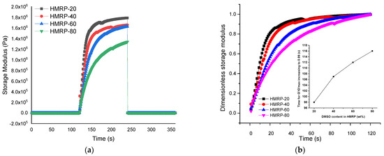 The transient response of PVA-based MRP samples to a stepwise magnetic field was tested to further understand the effect of DMSO content on the structure’s formation process driven by the external magnetic field. Figure 5 shows the time-rheological response of a stepwise magnetic field of PVA-based MRP samples. In this experiment, the storage modulus of PVA-based MRP samples was measured upon applying a stepwise magnetic field, where a magnetic field of 500 mT was instantaneously applied to and removed from the sample at 120 and 240 s, respectively. Moreover, the rearrangement process of CIPs in the PVA-based MRP matrix was further investigated by analyzing G′s time evolution in response to an instantaneously applied magnetic field. Thus, Figure 5b shows the dimensionless transient responses of the PVA-based MRP samples. The dimensionless storage modulus can be calculated using Equation (3) [36];