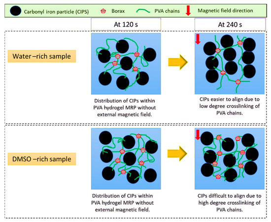 Schematic illustration of the mechanism of CIP movement upon the application of external magnetic field in water-rich and DMSO-rich PVA-based MRP.
