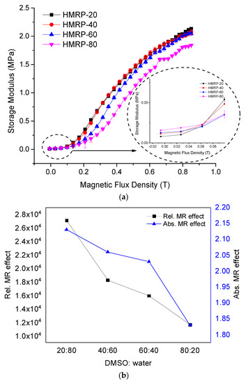 The shear storage modulus, G′, of PVA-based MRP samples with different DMSO contents under an excitation magnetic flux density up to 800 mT, is shown in Figure 7a, whilst the absolute and relative MR effect are calculated and displayed in Figure 7b.