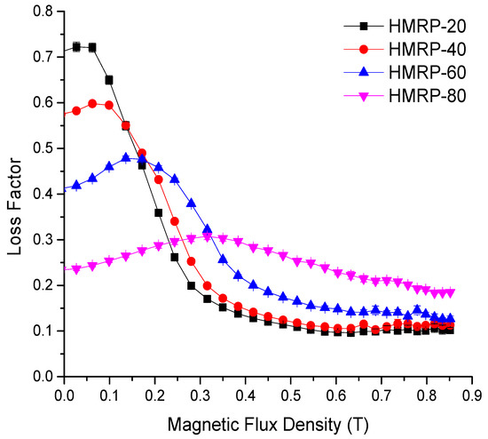 Likewise, the loss factor leveled off with further increase of magnetic flux density above 0.4 T, indicating that the interactions between the CIPs had reached the saturated stage. This meant that at this stage the particles received maximum forces and were in a stable state resulting the value of the loss factor reaching a plateau. Moreover, as shown in Figure 7, HMRP-80 had a higher loss factor at a magnetic flux density above 0.4 T due to the matrix’s higher restriction, which reduced the interaction between the CIPs. According to Yang et al. [39], the damping properties of MR materials are derived from intrinsic damping (particle-matrix interaction) and interface damping (friction loss due to slip between particles and matrix). However, in the current study, as the content of CIPs was the same for all PVA-based MRP samples, the intrinsic damping could be neglected. Thus, the damping properties were mainly affected by interface damping resulting from the friction between the polymer matrix and the CIPs itself. So, it can be concluded that HMRP-80 samples exhibited a larger dissipation energy than others due to higher friction between the CIPs and the matrix during the CIPs’ movement. Interestingly, this behavior suggests that the physical state of HMRP-80 was more likely to be as a solid-like MR gel (MR plastomer). At the same time, the other samples showed characteristics of liquid-like MR gels [37].