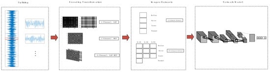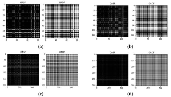 - Encoding transformation. By the above transformation method, every segment is converted into a one-channel or two-channel image. The entire original vibration signal is converted into a large number of feature images. In this step, three transformation methods are considered feasible. There is GAF for the one-channel image, MTF for the one-channel image, and GAF and MTF for the two-channel image. We will compare the diagnostic accuracy of these methods in the experiment.