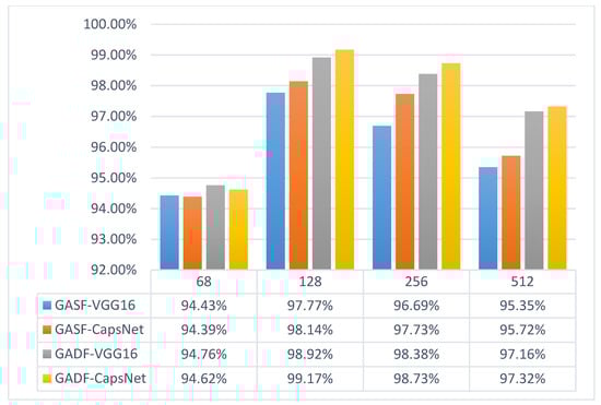 - The GAF technique retains sufficient bearing failure characteristics. Neural networks more easily extract fault features and perform classification and diagnosis by GAF images. For the capsule network and VGG network, the original vibration signal cut into 128 and converted into a 128 × 128 GAF image has a better performance compared to other cut lengths. GAF-CapsNet has, at most, 99.17% accuracy in training 128 × 128 GAF images.