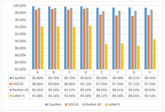 - The four-category dataset and the 10-category dataset have an average accuracy of 99.8% and 99.5% on GAFMTF-CapsNet. Using GAF and MTF images as two-channel inputs in the neural network allows the network to be trained to obtain both the static information by GAF and dynamic information by MTF for the vibration signal. For this signal processing method (GAFMTF), CapsNet has 1–2% higher diagnostic accuracy than VGG16 and ResNet-50, and 5–10% higher accuracy than LeNet-5.