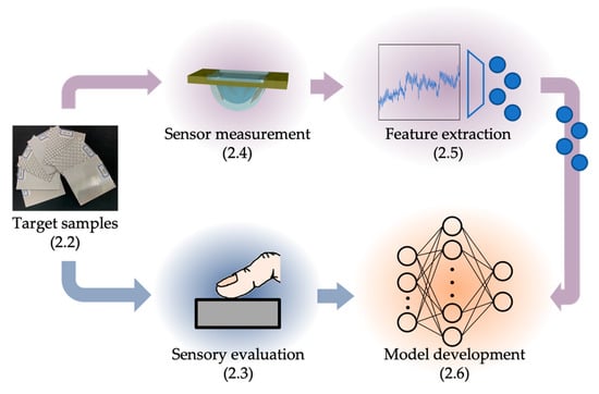Strategy for developing a tactile estimation model. The number in parenthesis for each item refers to the section in which the item is described, (Section 2.2) target samples, (Section 2.3) sensory evaluation of samples, (Section 2.4) tactile sensing system and experimental conditions, (Section 2.5) feature extraction for the data acquired by the autoencoder, and (Section 2.6) establishment of a tactile estimation model through machine learning.