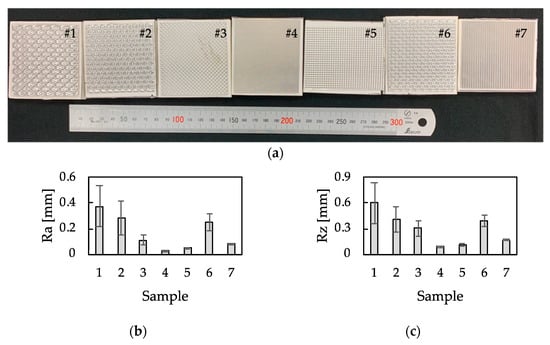 Information about seven aluminum samples. All samples are embossed. (a) Images of aluminum test samples. The sample number is given above each sample. (b) The arithmetic mean roughness (Ra), (c) the maximum height (Rz) ().