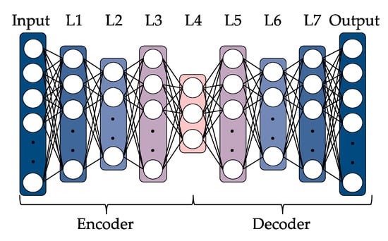 An autoencoder is a kind of neural network used for dimensional compression. The simplest autoencoder has three layers, namely an input layer, intermediate layer, and output layer. The numbers of neurons in the input and output layers are set equal, and the same data are used as the input and the target output during training. The number of neurons in the intermediate layer is set to be smaller than that in the input and output layers. The layer that performs compression (from the input layer to the intermediate layer) is called the encoder, and the layer that performs restoration (from the intermediate layer to the output layer) is called the decoder. By learning the parameters that minimize the difference between the input and target output, the output values of the neurons in the intermediate layer can be used as dimensionally compressed features [35]. The deep autoencoder shown in Figure 4 is an application of the autoencoder. It has been shown that a neural network with more than one intermediate layer and a sufficiently large number of neurons in the intermediate layer can approximate arbitrary functions [36,37]. This approximation allows for the use of a deep autoencoder to develop models that can be used for more diverse expressions compared to a simple autoencoder with a single intermediate layer.